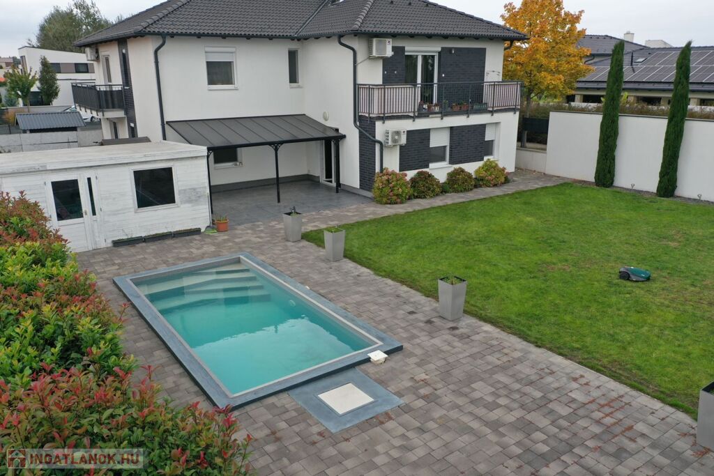 Kiemelkedően igényes környezetben, 61 m²-es, 2 szoba + nappalis lakás eladó, 350 m² saját kerttel, 25 m² terasszal, medencével, 20 m²-es kerti faházzal és 2 gépkocsibeállóval.