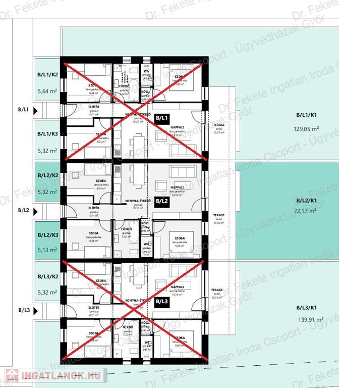 Minden lakás mérete megegyezik, csak a kert mérete változó. (Lásd alaprajzok)