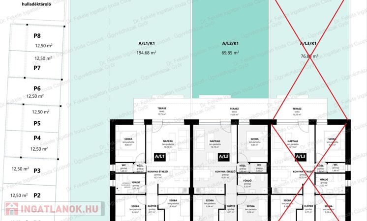 Minden lakás mérete megegyezik, csak a kert mérete változó. (Lásd alaprajzok)