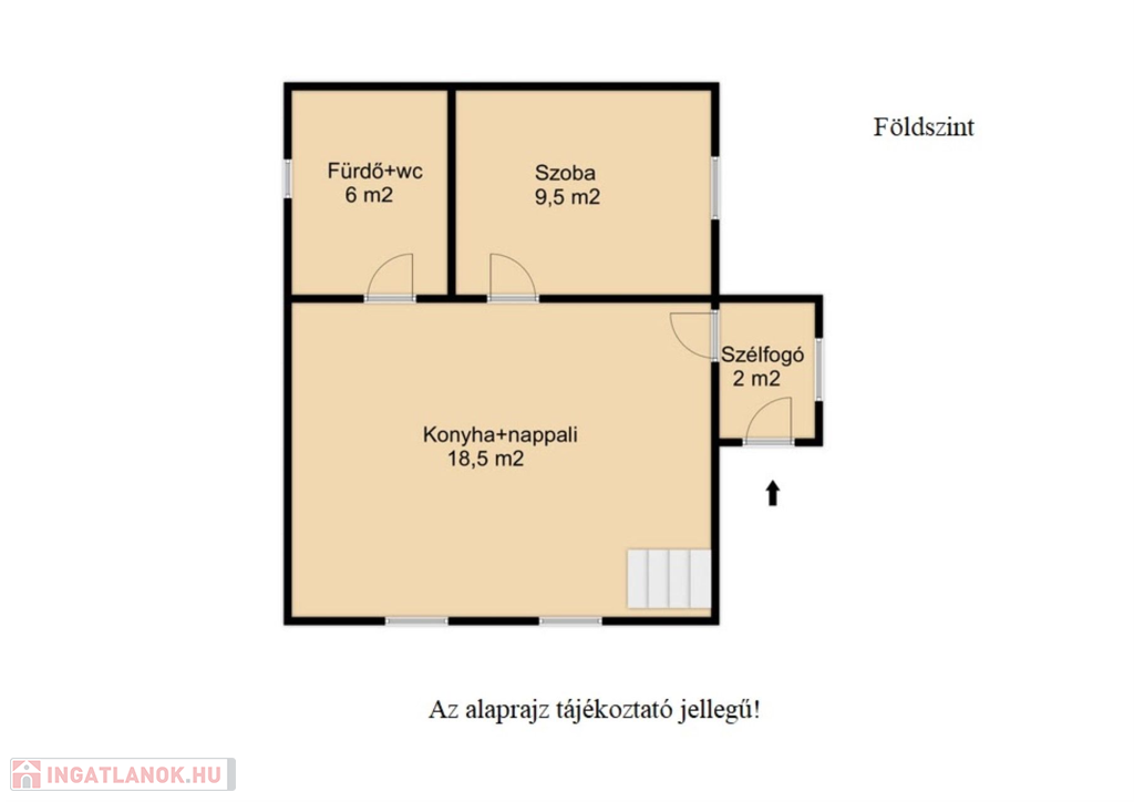 Az ingatlan két szintes, a földszinten a nappali és a konyha egy légtérben kapott helyet, emellett itt található a hálószoba és egy tágas fürdőszoba is. Az emeleti részen egy tároló és egy egy légterű szoba található.