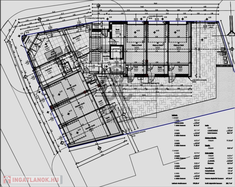 A társasházban 50 - 65 nm-es lakások találhatók. Minden lakáshoz tartozi önálló tároló, melynek megvásárlása kötelező: ára 2.4 MFt.