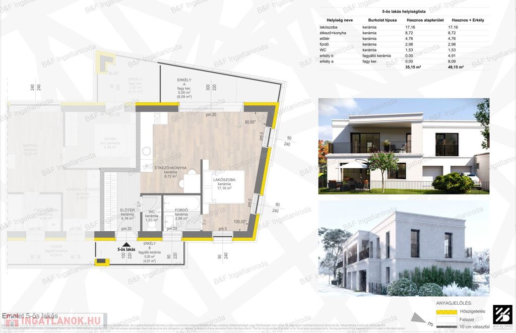 A lakás hasznos alapterülete 35,15 m2 + van hozzá 2 db erkély melyek közül az egyik 4,91 m2 és a másik 8,09 m2.