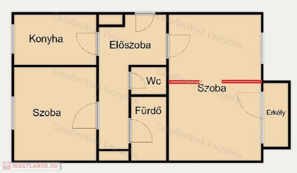 - A lakás helyiségei: előszoba, konyha, 2 db szoba, wc, fürdőszoba, erkély.
