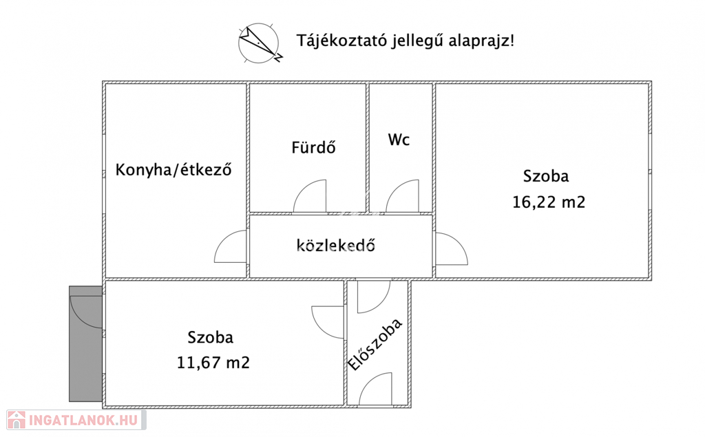 - 1 egész szobából, 1 félszobából, előszobából, konyhából/étkezőből, fürdőszobából, valamint WC-ből áll.