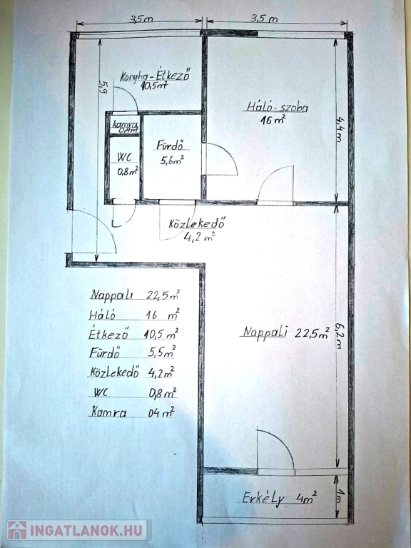nappali 22,5m2, közlekedő 4,2m2, szoba 16m2, fürdőszoba 5,6m2, konyha-étkező 10,5m2, wc 0,8m2, kamra 0,4m2, erkély 4m2;
