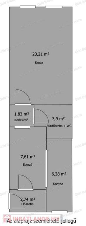 - előszoba, konyha, étkező, közlekedő, hálószoba, fürdőszoba zuhanyzóval + WC
