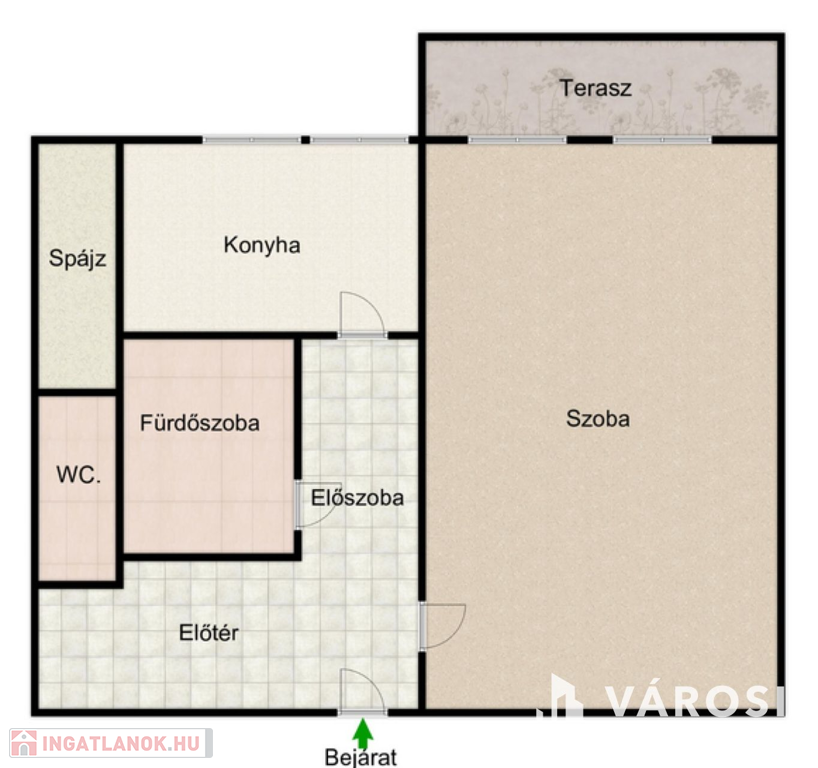 - Előtér, szoba, konyha, spájz, fürdőszoba, külön WC. terasz.