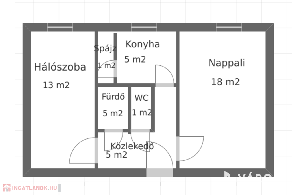 A lakás 1 nappaliból (18 m2), egy hálószobából (13 m2), közlekedőből (5 m2), konyhából (5 m2), spájzból (1 m2), WC-ből (1 m2) és fürdőszobából (5 m2) áll. Egyedi hőfokszabályzós radiátorokkal történik a fűtése távfűtéssel, igen kedvező számlákat produkálva.