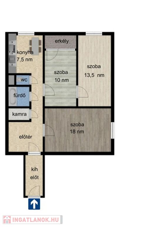 - 3 szoba, konyha, fürdő, WC, erkély, kamra, előtér.