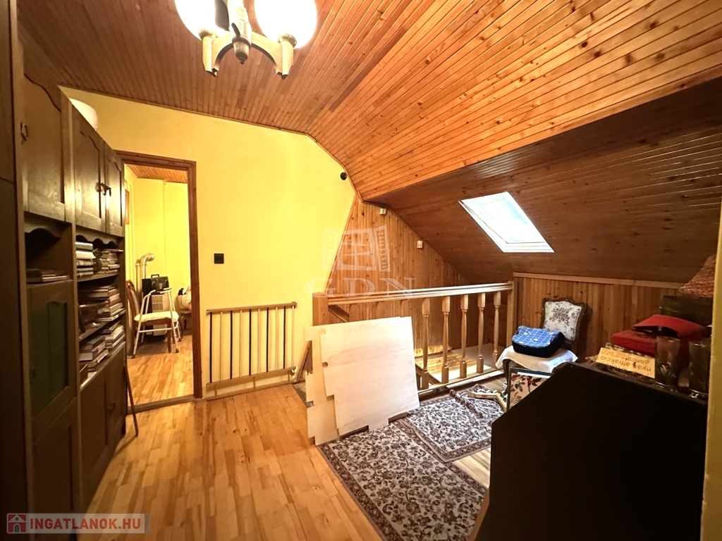 Az alsó, 52 m2-es szinten egy méretes gardróbos és tárolós előtér, konyha, kamra, fürdőszoba, nappali, valamint egy szoba, míg az ingatlan emeletén 2 szoba, egy dolgozó és egy mellékhelyiség került kialakításra.