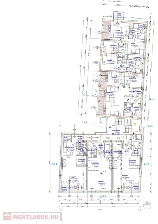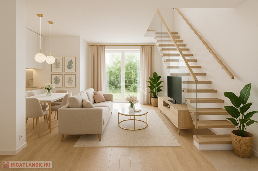 A lakásban az alsó szinten egy tágas közösségi tér (nappali-konyha-étkező), előtér és mellékhelyiség kerül kialakításra, míg a felső szinten két szoba, gardróbszoba és fürdőszoba kap teret. Igény esetén a lakásban egy további szoba is kialakítható. A lakás nappalijából egy méretes 17 m2-es erkély, míg a felső szinten az egyik szobából 3 m2-es erkély nyílik a zölddel borított udvarra.
