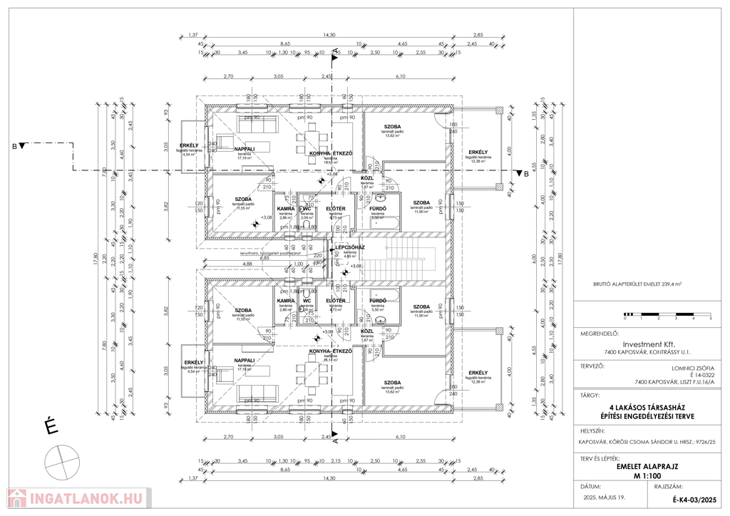 Kaposváron a Kecelhegyi városrészben, a Kőrösi Csoma Sándor utcában, új építésű, exkluzív - magas minőségben kivitelezett, korszerű építőanyagokból épülő, energiatakarékos társasházban - 4 db lakás eladó. A társasház földszintjén 2 db 97,91 m2-es lakás, míg az 1. emeleten 2 db 96,13 m2-es lakás kerül kialakításra. Minden lakásban előszoba, nappali - terasz vagy erkély - konyha, 3 szoba, fürdőszoba-wc helyiség lesz kialakítva, továbbá minden lakáshoz megvásárolható önálló tároló és egy felszíni parkoló, illetve a mélygarázsban 2 db beálló, elektromos autótöltővel. A kerítés kialakítása oly módon történik, hogy a felszíni parkolót kapunyitás nélkül is meg lehessen közelíteni. A korszerű, modern energetikájú - ezáltal alacsony rezsivel rendelkező - épület fűtése és hűtése levegő-víz hőszivattyúval lesz biztosítva, igény szerint napelemes támogatással, továbbá fan-coil rendszer szolgáltatja az igényelt hőmérsékletet a lakásban. A hőszigetelt faszerkezetű nyílászárókhoz igény szerint zsaluziák lesznek felszerelve, illetve prémium minőségű szaniterek és szerelvények, illetve csapok kerülnek beépítésre. A megállapodás szerint a konyhabútort (bútorlapból) igény esetén az eladó fogja legyártatni, amelyre a felek külön megállapodást kötnek. A lakáshoz tartozó önálló udvar mérete lakásonként 200 m2. A lakások az ideális lokáció miatt jó választás lehet családoknak és befektetőknek egyaránt - élelmiszerbolt, iskola, óvoda és buszmegálló gyalogos távolságban percek alatt elérhető. Az épület teljes kivitelezése és a műszaki átadása várhatóan 2026. IV. negyedévben történik meg.Energetikai besorolás: A