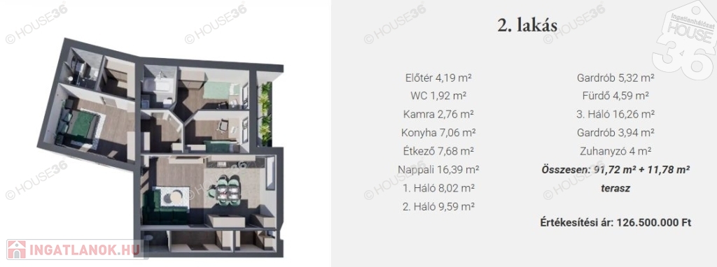 2-es lakás 91,72 m2 + 11,78 m2 terasz, nappali + 3 szoba, dupla fürdő, gardrób.