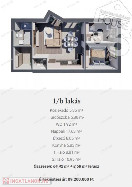 1/ b földszinti lakás teraszkapcsolattal 64,42 m2 + 8,58 m2 terasz, nappali + 2 szoba.