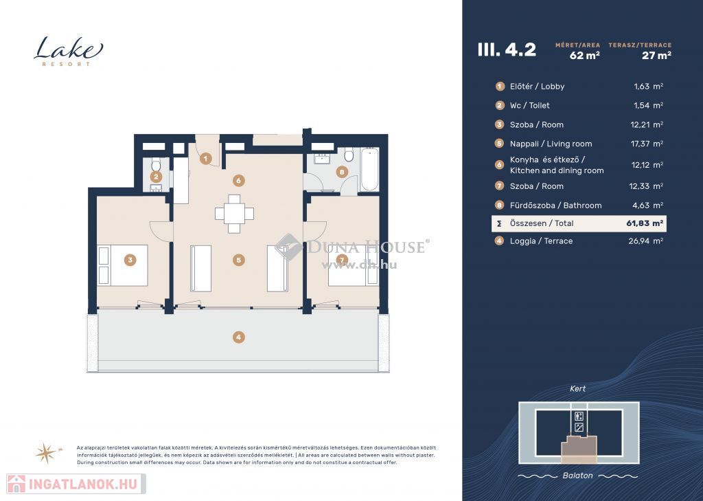 A Lake Resort lakópark Keszthely centrumától délre található Helikon ligetben, a Balaton nyugati oldalán, partközelségben természet közeli környezetben a volt Zala Kemping és Üdülőfalu területén helyezkedik el. Az ingatlan előtt húzódó Entz Géza sétány kerékpárútban végződik, ezáltal az ingatlan zárt szakaszon biztosítja a lakók személygépkocsival való bejutását. A 7,2 hektár nagyságú telek Balaton felőli oldalán ősfás parkosított szakasz nyúlik, a vízparton való pihenéshez, horgászathoz közvetlen móló vagy stég áll rendelkezésre. A déli oldalon húzódó zöld övezet a túrázni, sportolni vágyóknak és kis házi kedvencekkel való sétáláshoz ad tökéletes helyszínt. A tömb északi oldalán a Helikon Horgász Egyesület helyezkedik el.A Lake Resort, projektünk első ütemében 5, a második ütemben 7 házból álló 288 lakásos lakópark kerül kialakításra. A projekt első üteme 2022 első negyedévében kezdődött, kulcsrakész okos megoldással kialakított lakások műszaki átadása 2023 negyedik negyedévétől veszi kezdetét. A telek adta méreteinek és ősfás területének köszönhetően, gondozott parkok, játszó- és sport kertek, tanösvények, piknik/grillezéshez kialakított helyek, privát medencék és saját móló/stég nyújtanak felemelő kikapcsolódási élményeket. A területen megvalósuló Lake Resort lakópark a hely kiemelkedő adottságait kihasználva, könnyed, látványos építészeti megjelenésével harmonikus lakókörnyezetet teremt. Az épületek az Entz Géza sétány felől egy távirányítós rendszerrel ellátott sorompós behajtón, illetve személybejárón keresztül közelíthetőek meg. A lakóházak földszintjén fedett garázs, elektromos autótöltési lehetőség, zárt bicikli és egyéb tárolók találhatók. Az épületek aljában kereskedelmi és szolgáltatóegységek kerülnek kialakításra. A stúdió, közepes és deluxe méretű lakások elsőtől harmadik emeletig szintenként 7-7 lakással, saját erkéllyel lettek tervezve, a felső negyedik szinten pedig összesen három, két penthouse és egy közepes méretű lakás kap helyet privát teraszokkal. Lakásaink között elérhető 30 m2-től akár 150 m2-ig, melyek hozzájárulnak a minőségi életvitelhez és a gondtalan pihenéshez. A Lake Resort Lakópark négy szinten három különféle méretű lakást kínál az érdeklődők számára. Célunk, olyan lakások, otthonok és nyaralók kivitelezése, melyek erkéllyel/terasszal, klimatizált, prémium minőségű alapanyagokkal, modern 21. századi műszaki technológiával épülnek. Valamennyi lakáshoz földszinti fedett garázs és tároló is igény szerint vásárolható. Igényeihez igazodó lakását még ma találja meg, további kérdéseivel keressen bizalommal.