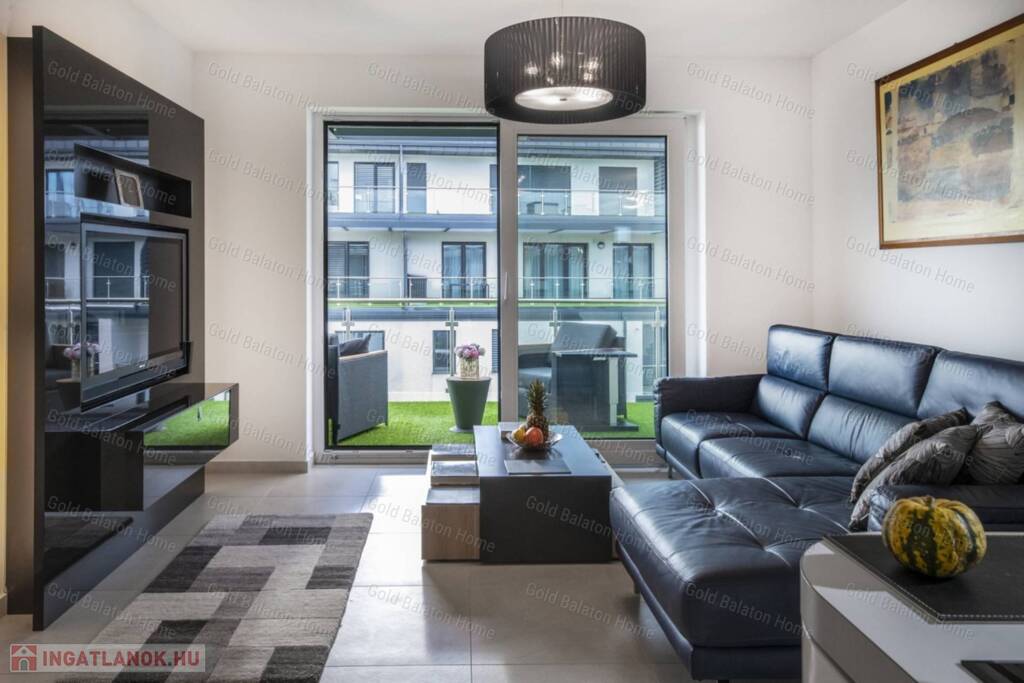 - a nappaliból, hatalmas tolóajtón át nyílik a műfűvel borított terasz, ahonnan évszaktól függetlenül bármikor élvezhető az örökpanorámás balatoni napfelkelte és naplemente; a teraszra a hálószobákból is ki lehet jutni