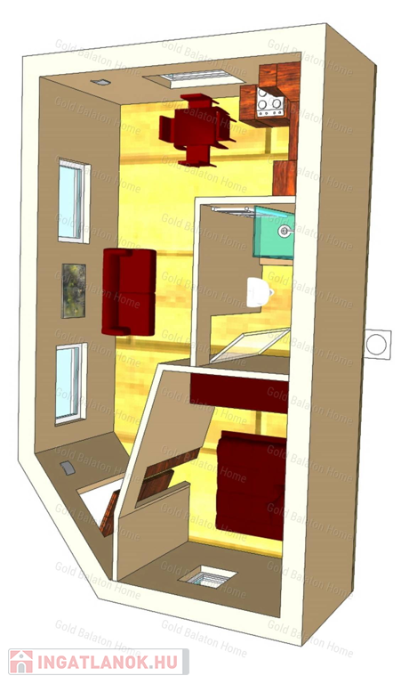 - földszint: a konyha-étkező egy légteret képez a nappalival és az előtérrel, fürdőszoba zuhanyzóval és WC-vel, hálószoba, kertre néző terasz