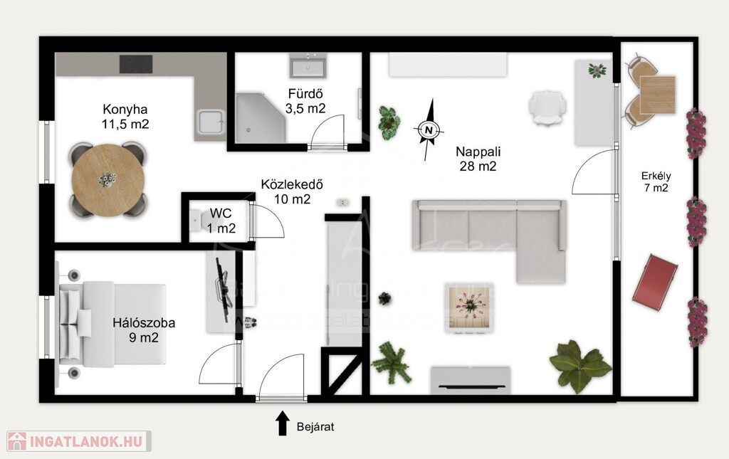 • A lakás alapterülete 63 m², melyhez egy 7 m²-es erkély tartozik
