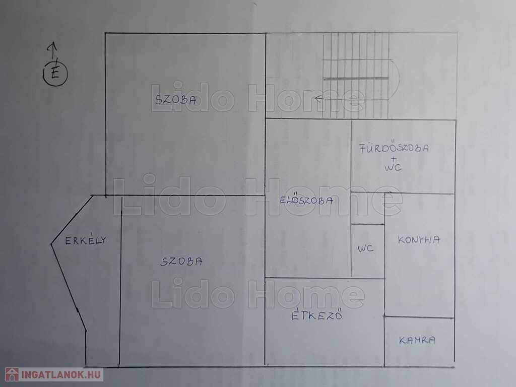 Lakás helyiségei: előszoba, 2 szoba, konyha- kamra - étkező, fürdőszoba zuhanyzóval és WC-vel, külön WC, erkély.