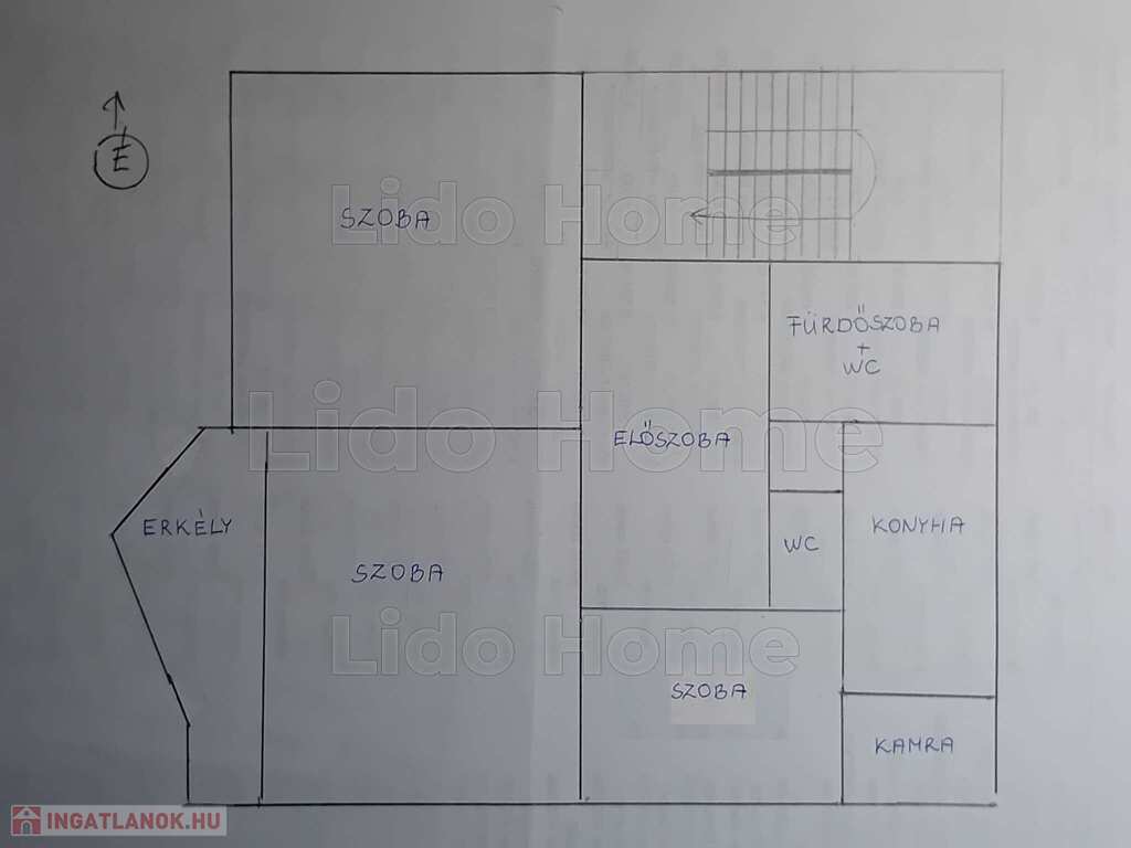 Lakás helyiségei: előszoba, 2 szoba, konyha, kamra, dolgozószoba/étkező, fürdőszoba zuhanyzóval és WC-vel, külön WC, erkély.