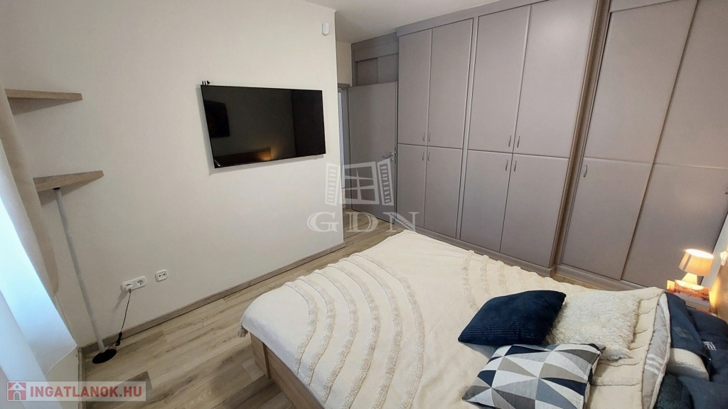 Az ingatlan belső elrendezése tudatos tervezés eredménye. Az előtérből külön WC, egy kis gardrób nyílik, valamint egy igényesen kialakított fürdőszoba. A hálószobában egyedi, beépített gardrób gondoskodik a praktikus és esztétikus tárolásról. A lakás központi tere a tágas, nagy belmagasságú amerikai konyhás nappali–étkező, amely világos, jól bútorozható.