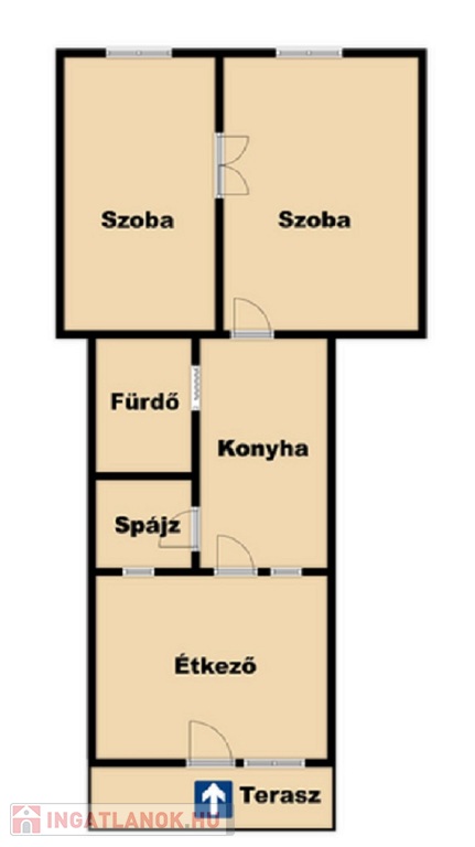 Lakás 59 m2 lakóterületű. Szoba, fürdőszoba, étkező, konyha és spájz helyiségekből áll.