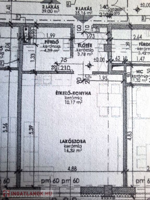 A lakás 35,16 nm, helyiségei:előtér 3,78 nm, fürdőszoba 4,89 nm, étkező/konyha 10,17 nm, nappali/lakószoba 16,32 nm.