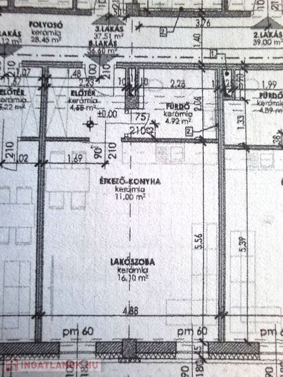 A lakás 36,60 nm, helyiségei:előtér 4,68 nm, fürdőszoba 4,92 nm, étkező/konyha 11,00 nm, nappali/lakószoba 18,10 nm.