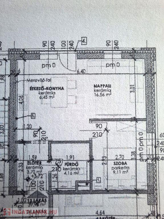 A lakás 39,98 nm, helyiségei:előtér 3,70 nm, fürdőszoba 4,16 nm, gardrób/szoba 9,11 nm, étkező/konyha 6,45 nm, nappali/lakószoba 16,56 nm.