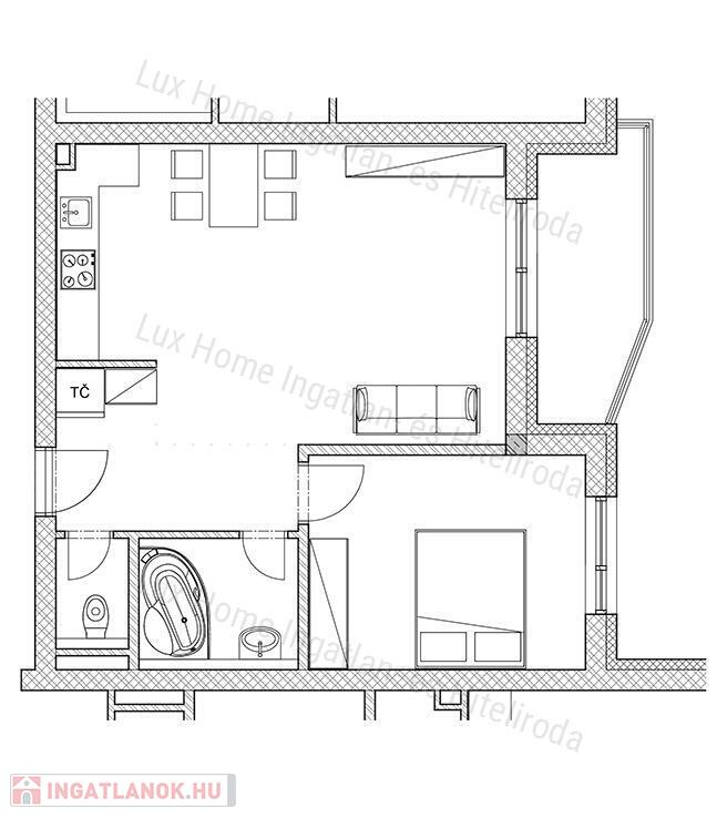 lett tervezve. A szoba laminált padlóval , a többi helyiség járólappal burkolt.