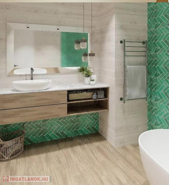 lett tervezve. A szoba laminált padlóval , a többi helyiség járólappal burkolt.