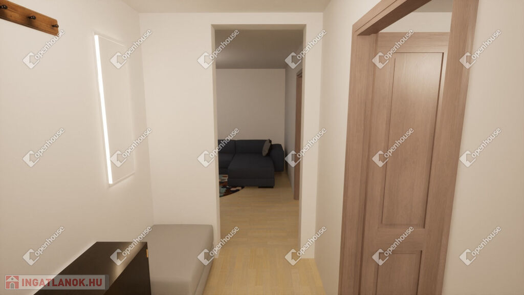 Belső elrendezése: előtér, nappali-konyha-étkező, hálószoba, fürdőszoba, erkély.