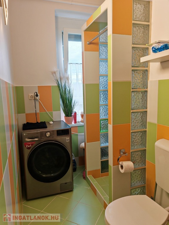 Fürdőben új szaníterek, modern burkolatok, épített zuhany kapott helyet.