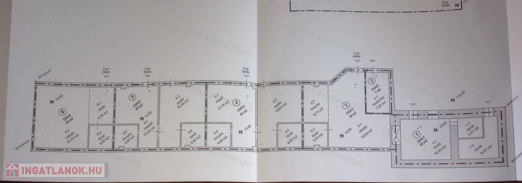 1. lakás 34 m2, 2. lakás 40 m2, 3. lakás 42 m2, 4. lakás 36 m2 kiszolgáló helyiségek: 31 m2