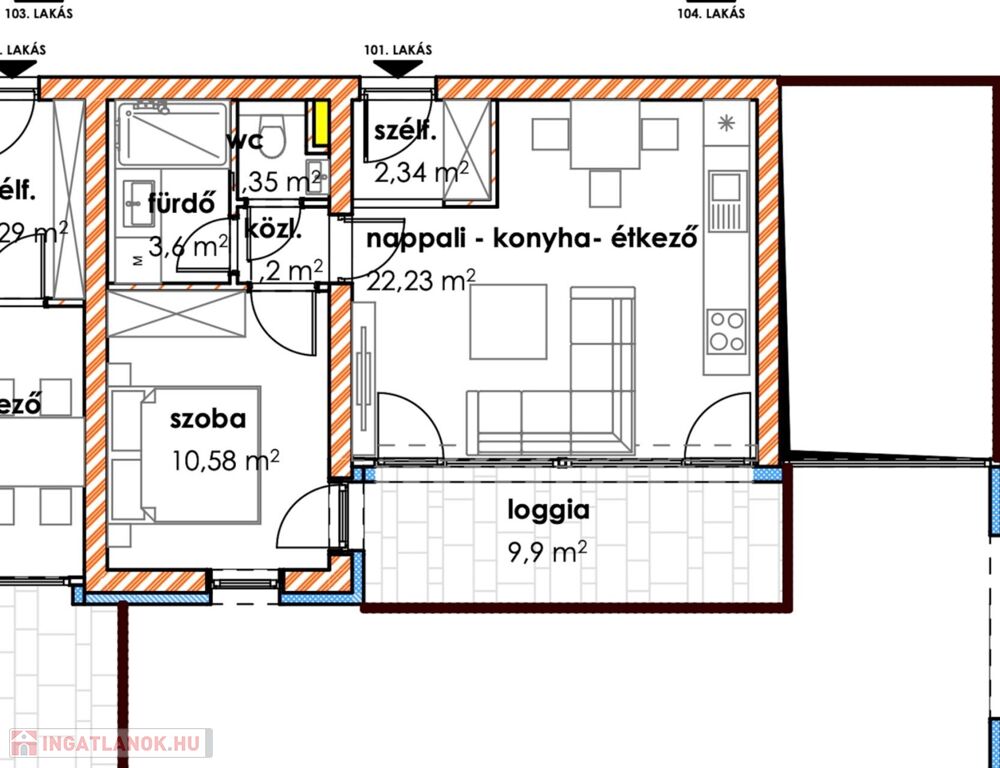 A 1 db amerikai konyhás nappalival, 1db hálószobával, 1 db fürdőszobával, közlekedővel, loggiával rendelkezik.