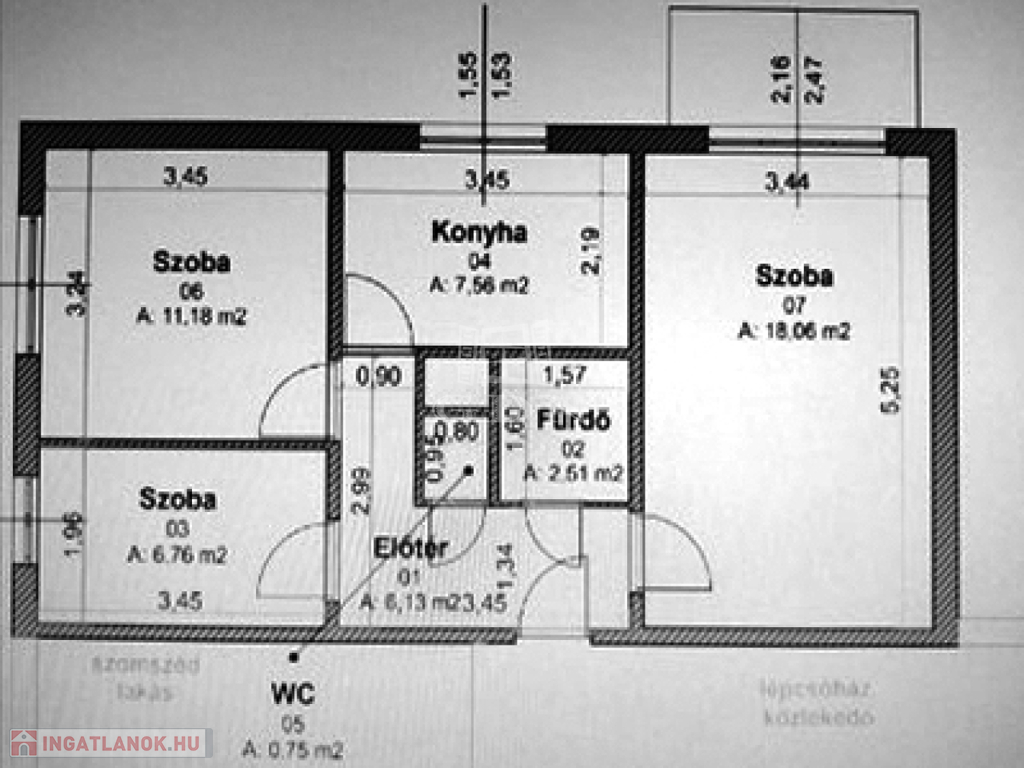 Elrendezés: 1 nappali + 2 hálószoba, konyha, fürdőszoba, WC, közlekedő, erkély