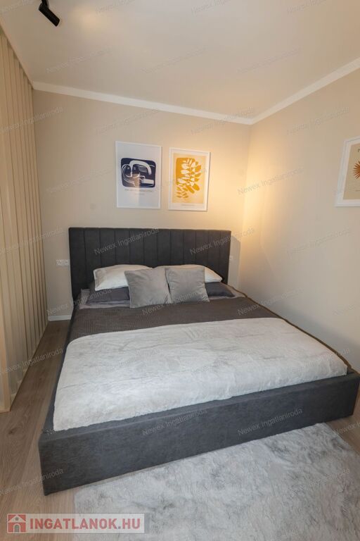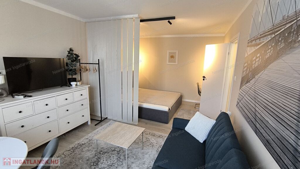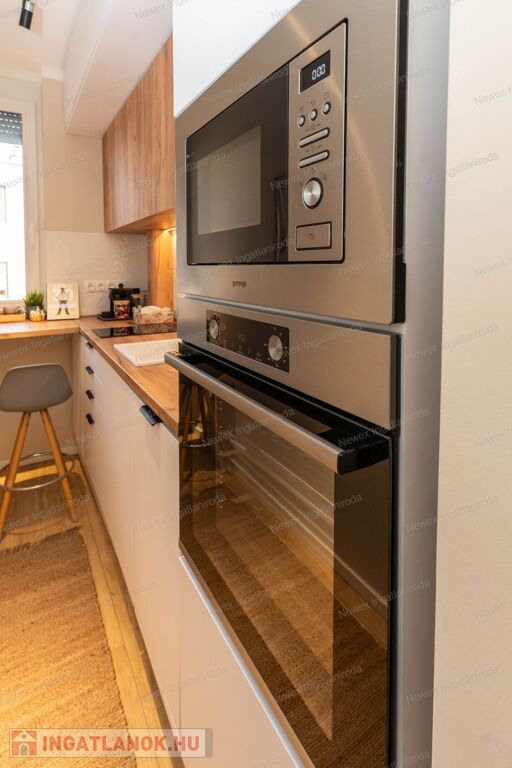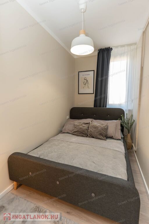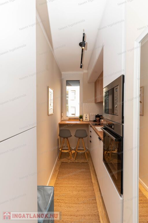 Ebben a felújított modern lakásban, jó elosztásban használhatja a 2 külön hálószekciót, a divatos térelemekkel határolt, de nyitott érzetű nappalit, az igényes zuhanykabinos fürdőszobát, valamint reggeliző sarokkal ellátott, teljesen felszerelt konyhát, az elektromos sütő és főző berendezéseket, a jégadagolós hűtőt, mely a külön nyíló kamrában került elrejtésre.