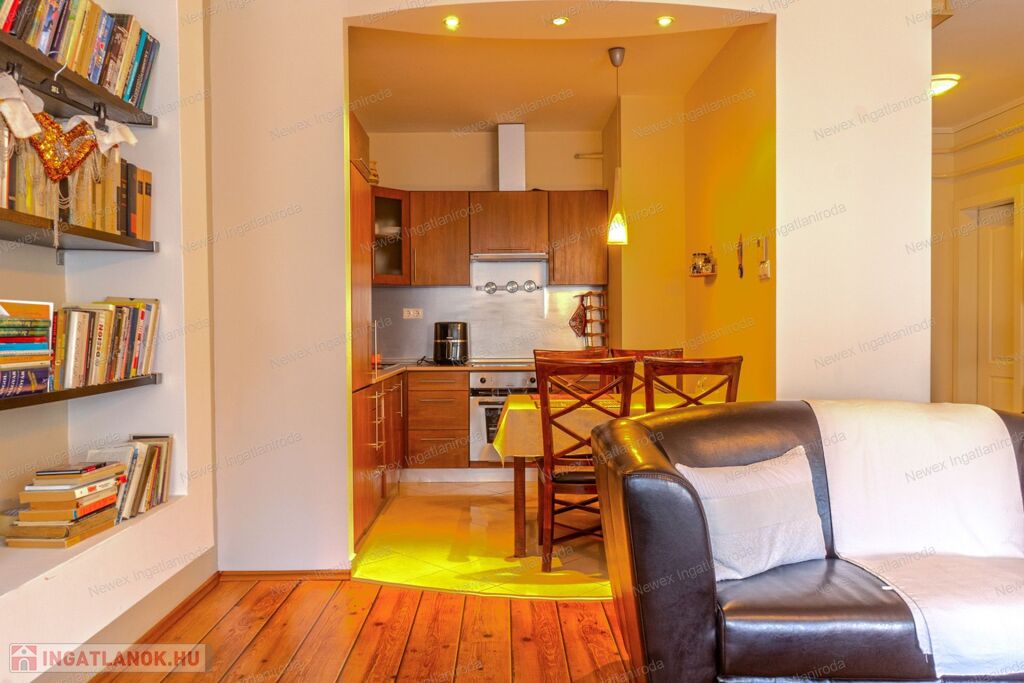 A napfényes nappali és konyha egy légtérben helyezkedik el, ami tökéletes a modern életvitelhez.