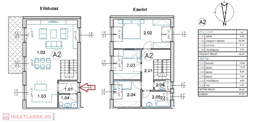 - a földszinten nappali, konyha-étkező, fürdőszoba-wc