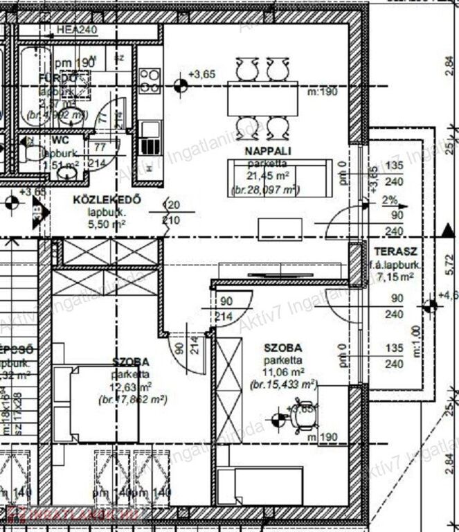 - bruttó 73,39 m2 + terasz ( nettó 54,39 m2 lakás+ 7,15 m2 Terasz),