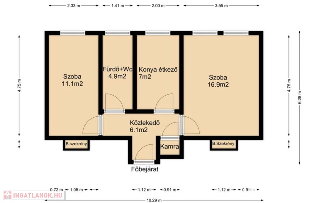 Belső lakrész helységei: 2 külön bejáratú szoba, közlekedő, kamra, fürdő mellékhelységgel együtt, étkezős konyha.