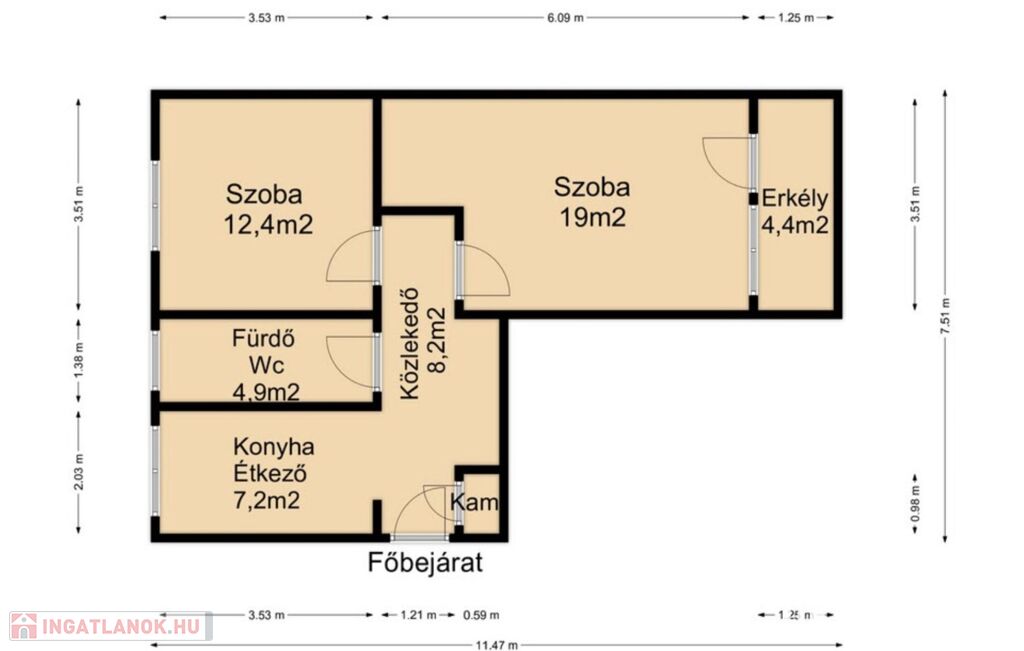 Belső lakrész helységei: 2 külön bejáratú szoba melyek közül a nagyszobához erkélykapcsolat is tartozik, közlekedő, konyha, kamra, fürdő mellékhelységgel együtt.