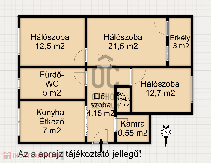 helyiségek: 3 hálószoba, ebből 2 szoba külön nyílik, konyha-étkező, közlekedő, kamra, fürdőszoba-WC