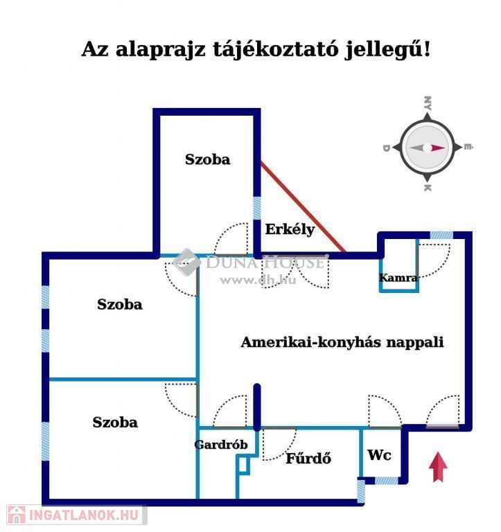 A 75m2-es ingatlanban 3 szoba, amerikai konyhás nappali, fürdő, külön WC, gardrób, kamra, és egy fedett terasz található.