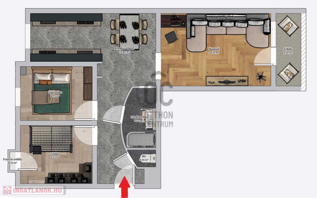 - 2. emeleti, 67 m2-es, 3 szobás.