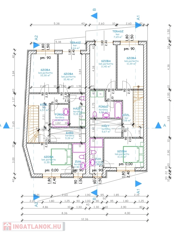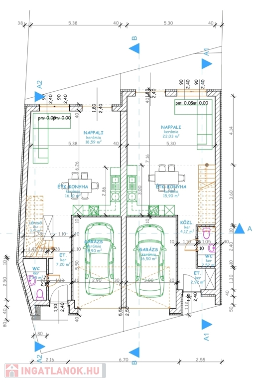 Nyíregyháza Belváros szívében, kertesházak környezetében, luxus felszereltségű, minőségi anyagokból készült ÚJ ÉPÍTÉSŰ, 126 nm-es, 3 szoba + nappali konyha étkezővel teraszkapcsolattal, 2 fürdő és 2 wc-vel, háztartási helységgel és gardróbszobával, választható járólap és laminált parketta burkolattal, egyedi gáz kondenzációs gázkazánnal padló fűtéssel, 2 db inverteres klímával, 3 réteg üvegezésű Kömmerling 7 légkamrás meleg peremes műanyag színezett nyílászárókkal, elektromos redőnnyel, 30-as Porotherm ragasztóhabos tégla építéssel, 10 cm-es grafitos homlokzati, 30cm födém szigeteléssel ellátott dupla soros tégla és garázsok mentén összeépített ikerház, 150 nm-es telken eladó. Kulcsrakész átadás legkésőbb 2026 ősze. A hátsó pihenőkertben ajándék műfűvesítéssel.Az ingatlan azonosítója: 98450Érdeklődni: +36702560693 Az ingatlan azonosítója: 98450 Érdeklődni: +36702560693