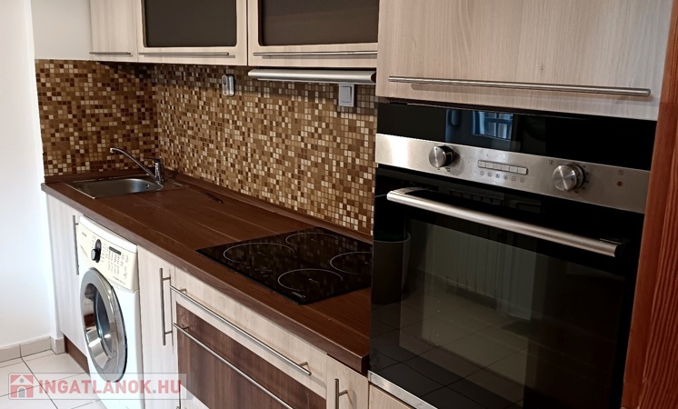 Újszerű, beépített, gépesített konyhabútorral,