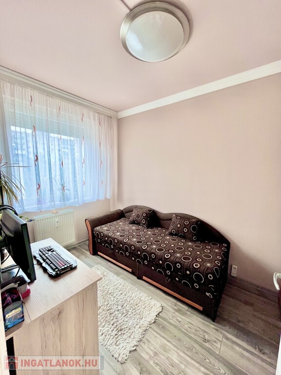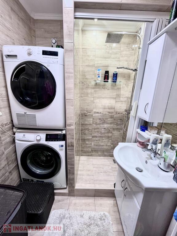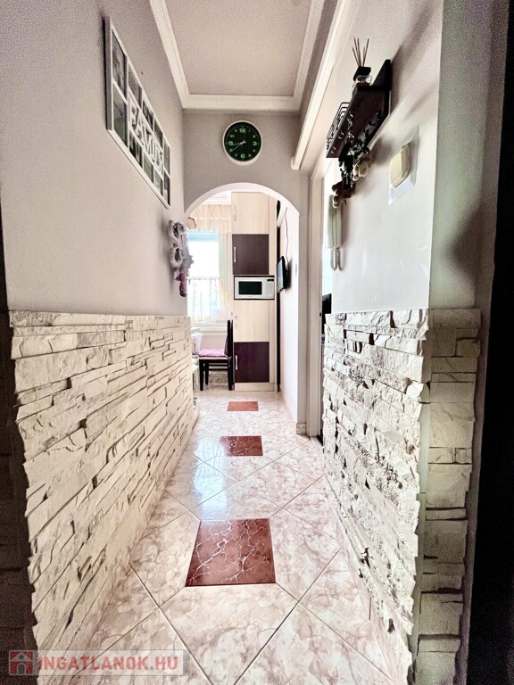 A lakás műanyag nyílászárókkal, redőnyökkel, biztonsági bejárati ajtóval felszerelt, felújított fürdőszobával és külön WC-vel várja új tulajdonosát. A konyhában beépített, gépesített konyhabútor található, amely – csakúgy, mint a többi helyiségben lévő beépített szekrények – a vételár részét képezi.