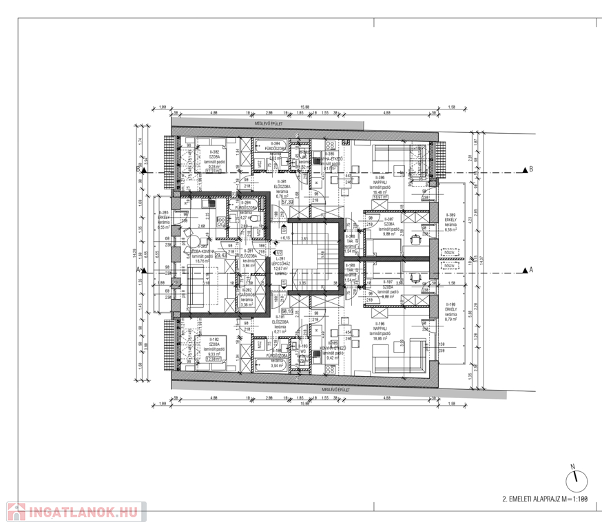 1/3 lakás: 62,91 m2, nappali + 2 szoba, tároló, erkély (6,05 m²), terasz (4,05 m²). Egyedi gázfűtés, padló fűtés. Ára: 68.200.000 Ft