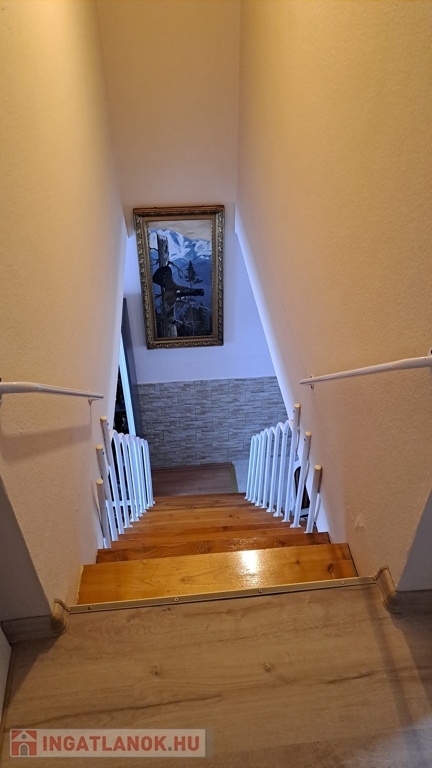 Alsó szint: nappali, 2 hálószoba, konyha + étkező, kamra, fürdőszoba (káddal és zuhanykabinnal), külön WC